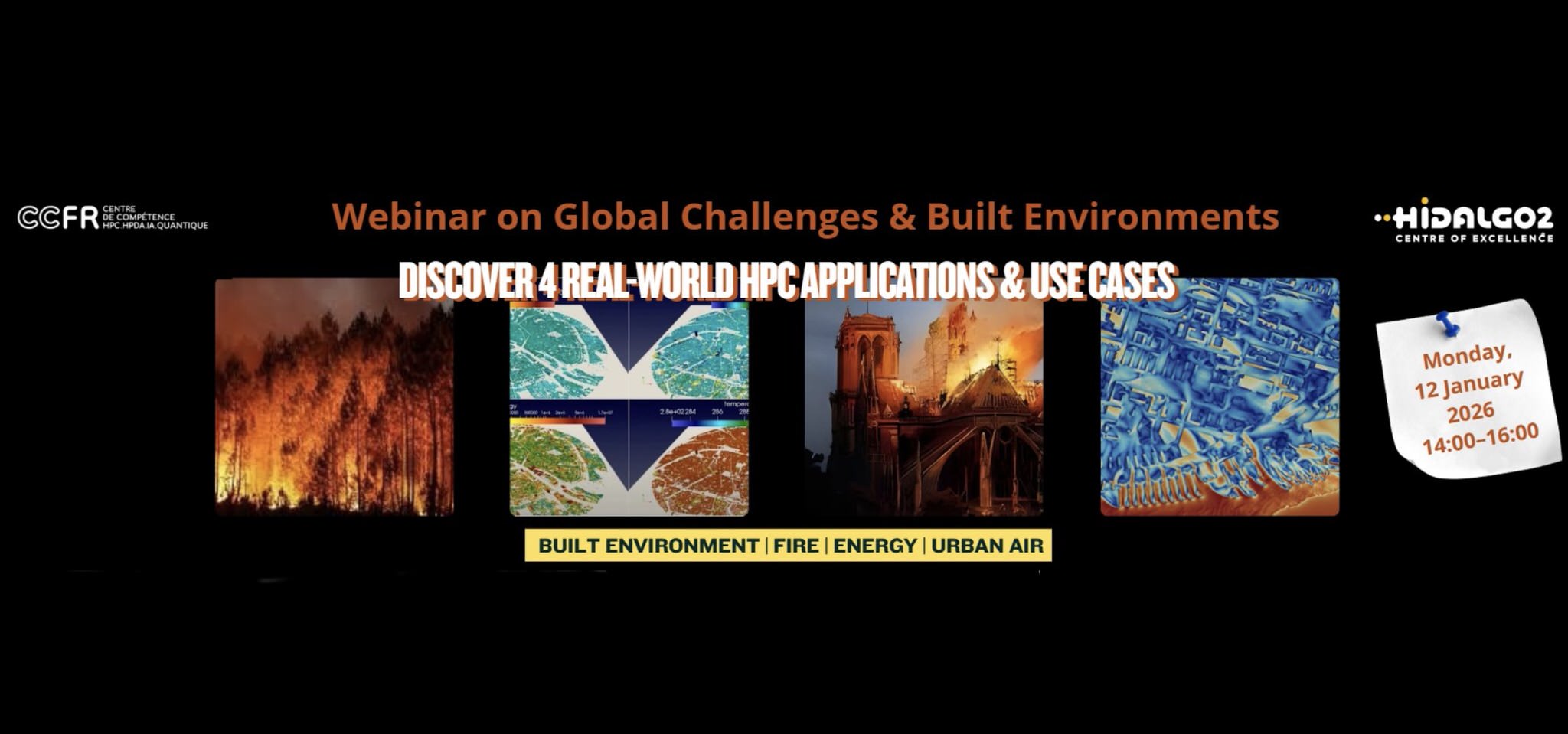 The online webinar, Global Challenges and the Built Environment: 4 HPC Applications and Use Cases, will be organized by the Centre de compétence HPC, HPDA et IA (NCC France) and the CoE HiDALGO2 on 12 January 2026.