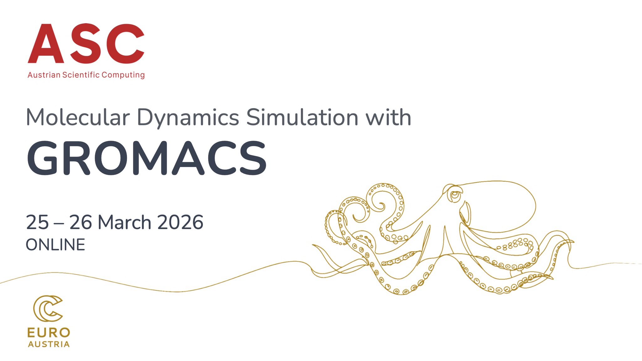 An online course on GROMACS for High-Performance Computing (HPC) will be organized by the Austrian Scientific Computing and EuroCC Austria on 25 and 26 March 2026. While the course focuses on core concepts and workflows, GROMACS is widely used in areas such as protein structure modeling and folding, biomolecular dynamics, membrane simulations, and computer-aided drug design.