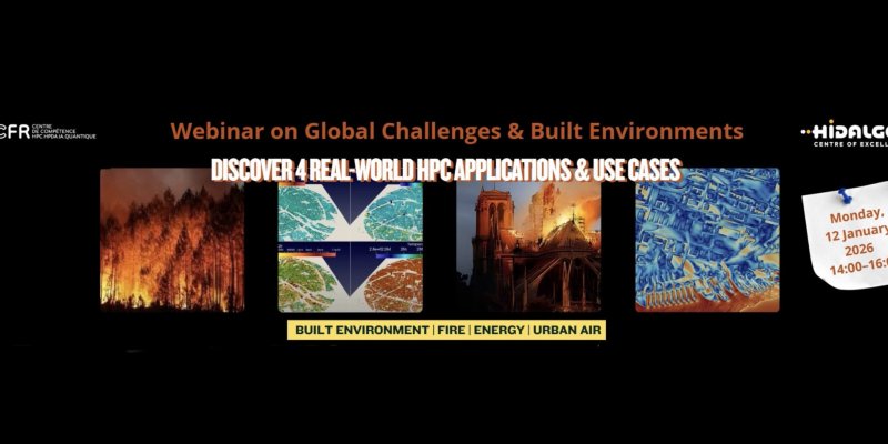 The online webinar, Global Challenges and the Built Environment: 4 HPC Applications and Use Cases, will be organized by the Centre de compétence HPC, HPDA et IA (NCC France) and the CoE HiDALGO2 on 12 January 2026. This short webinar will present four concrete use cases in high-performance computing, illustrated with real-world demonstrations, workflows and applied examples.