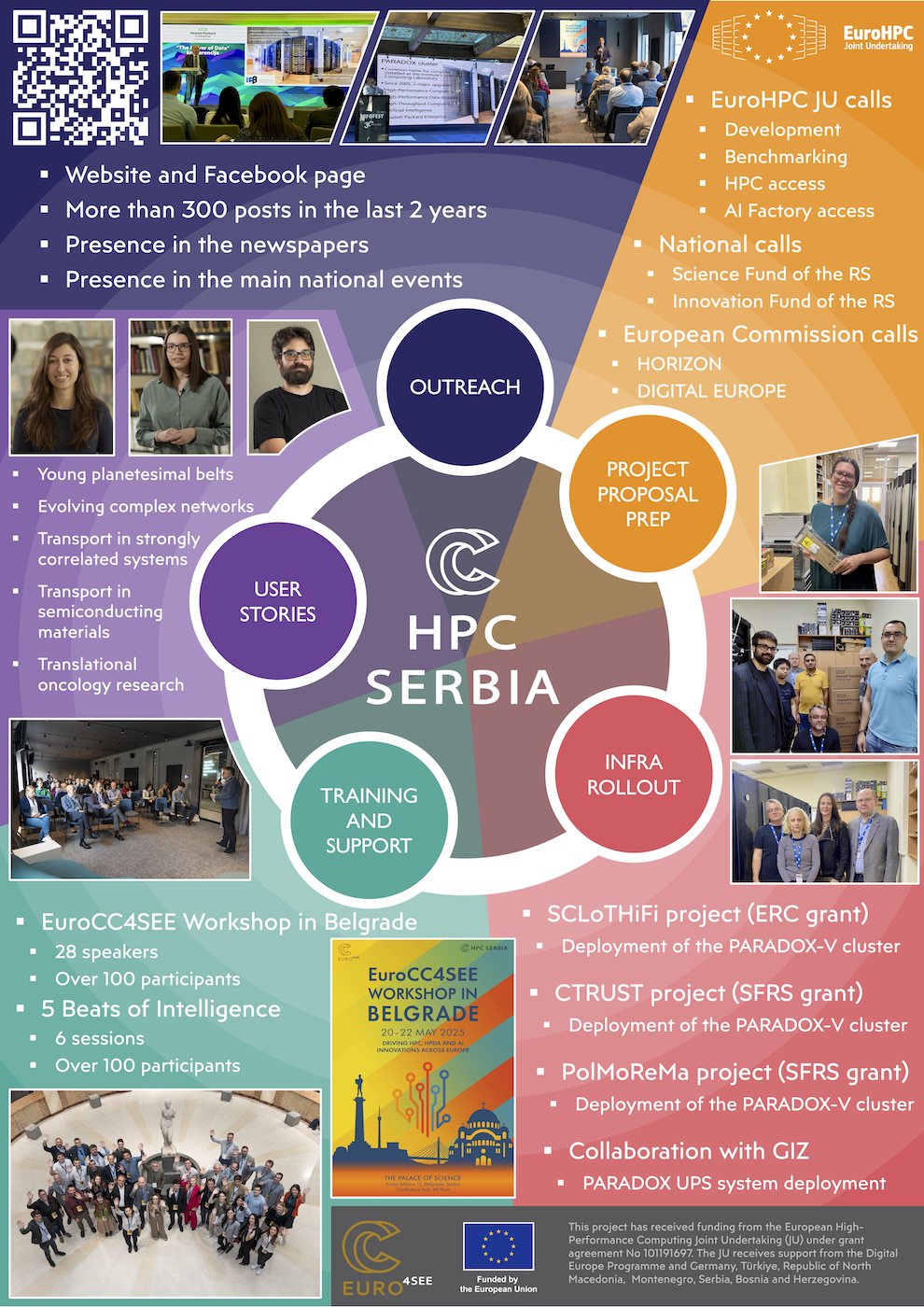 The EuroCC4SEE project (European Competence Centers for Southeast Europe) is a EuroHPC-funded program designed to build and enhance National Competence Centers (NCCs) specializing in high-performance computing (HPC), artificial intelligence (AI), and high-performance data analytics (HPDA) througho...
