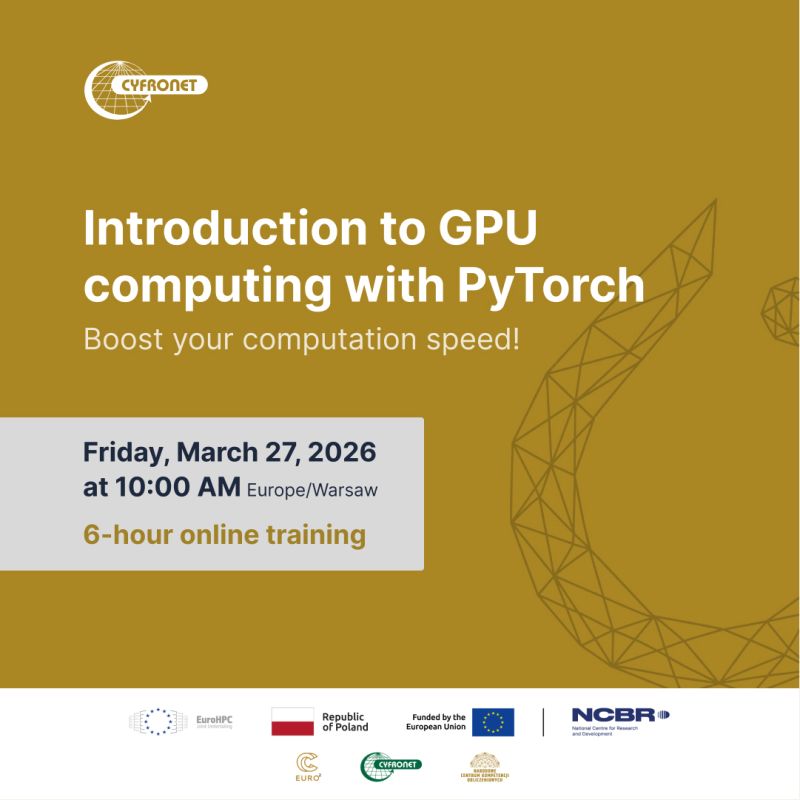 An online training on GPU computing with PyTorch will be organized by the Academic Computer Centre Cyfronet AGH and the National Centre for Nuclear Research as part of the EuroCC2 project on 27 March 2026. This training is intended for users who would like to accelerate their Python numerical computations using graphics processing units (GPGPUs).