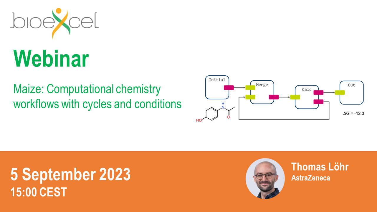 CoE BioExcel is hosting a webinar on Computational chemistry workflows with cycles and conditions using Maize on 5 September 2023. Thomas Löhr from AstraZeneca will introduce Maize and demonstrate solutions to common problems in computational chemistry and early-stage drug discovery projects.