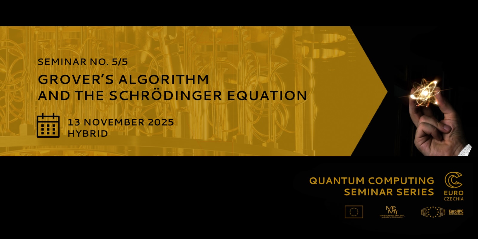 EuroCC Czechia, LUMI AI Factory, and EuroCC Germany (SIDE), a CoE HiDALGO2, invite you to a hybrid seminar on quantum computing on 13 November 2025. The event will cover Grover’s Algorithm and the Schrödinger Equation, focusing on a quantum algorithm for estimating eigenvalues and singular values of parameterized matrix families, which are important in quantum simulations. This method combines amplitude amplification and phase estimation to find eigenvalues through singular-value minima. Additionally, a quantum adaptation of the pseudospectral collocation method for the Schrödinger equation will be showcased, demonstrating favorable scaling (up to \(O(\sqrt{N})\)) compared to classical approaches of \(O(N^2)\). The technique also avoids unstable matrix inversion and is ideal for high-dimensional molecular systems with dense spectra.