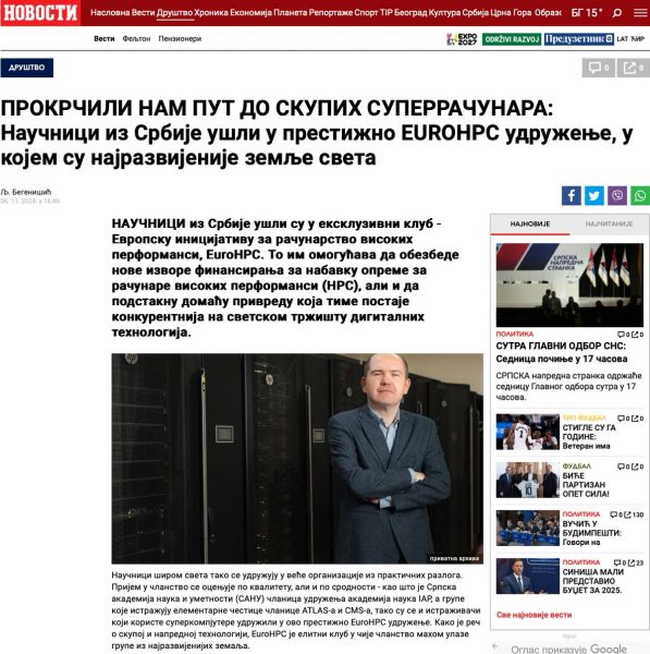 Yesterday, the Serbian daily newspaper Evening News (Večernje novosti) published a story about HPC Serbia and Serbia's involvement in EuroHPC projects. The article, titled They Paved the Way for Supercomputers, features an interview with Dr. Antun Balaž, the leader of HPC Serbia. Dr. Balaž highlighted the significance of the EuroCC and EuroCC4SEE projects, noting that they connect Serbia with leading European centers for high-performance computing (HPC). He also emphasized that these initiatives aim to support the implementation of HPC in academic institutions, the public sector, and interested small and medium-sized enterprises. "This support is crucial for enhancing competitiveness and developing new products and services in a knowledge-based society, which is a strategic goal for our country", Dr. Balaž stated. He added that Serbia's membership in EuroHPC last year has opened up opportunities for researchers to participate in projects funded by this program.